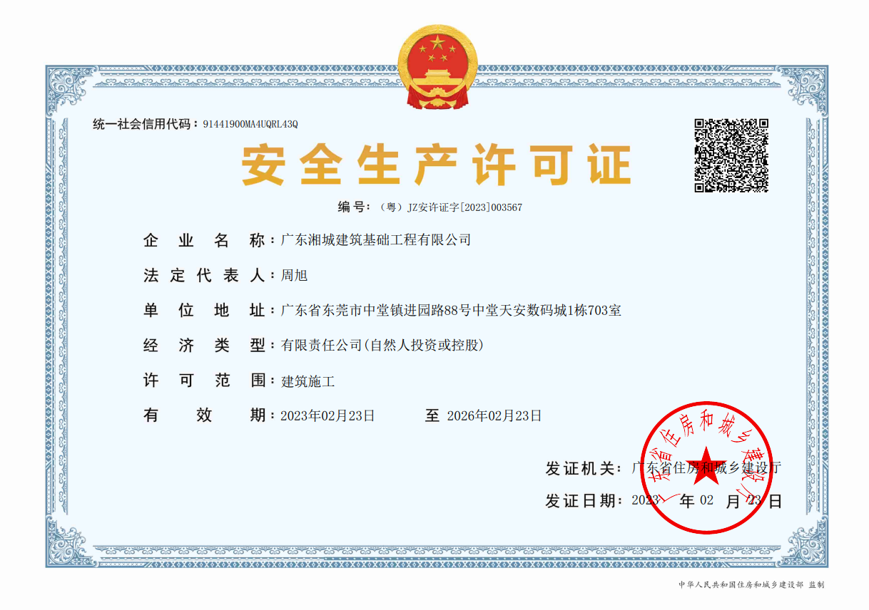 廣東湘城建筑基礎工程有限公司,成立于2016年,注冊資金4888萬元,持有地基基礎工程專業(yè)承包壹級資質(zhì),具有安全生產(chǎn)許可證。可承接各種基礎類施工,包括各類樁基礎、基坑支護、邊坡支護、地基強夯處理等施工業(yè)務。公司為地基與基礎工程專業(yè)承包、工程施工、技術咨詢、技術開發(fā)、技術服務、信息咨詢實體型企業(yè)。